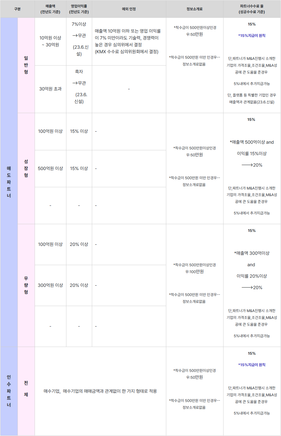 ㅇ파트너가 M&A정보를 KMX에 제공 후 성공시 지급(매도측 파트너는 일반형15%, 성장형20%, 우량형30%) ~ 상기표에서 유형별기준 참고. 단, 매수측 파트너는 20% 지급